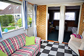 Die Ferienwohnung ist aufgeteilt in ein Wohnzimmer mit offener Küche, zwei Schlafzimmer, (zwei Einzelbetten stehen davon in einem der Schlafzimmer und können auch separat in das andere gebracht werden), weiterhin ein Badezimmer mit Dusche und WC. Auf der Vorderseite des Hauses befindet sich eine eigene kleine Terrasse.