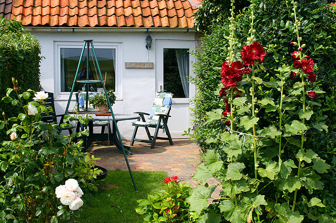 Die Ferienwohnung hat eine eigene Terrasse im großen gemeinschaftlichen Garten.