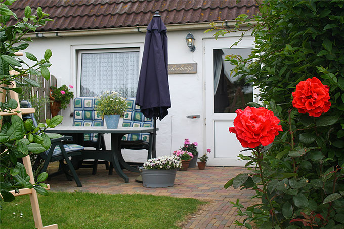Die Ferienwohnung hat eine eigene Terrasse im großen gemeinschaftlichen Garten.